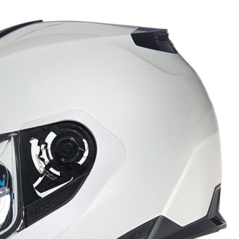 - Rotación de la mentonera: la trayectoria elíptica mantiene la parte frontal del casco en posición abierta. De este modo, se reduce considerablemente el efecto "vela" y se garantiza el confort de conducción, incluso con la mentonera levantada.