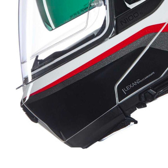 - Rotación de la mentonera: la trayectoria elíptica mantiene la parte frontal del casco en posición abierta. De este modo, se reduce considerablemente el efecto "vela" y se garantiza el confort de conducción, incluso con la mentonera levantada.